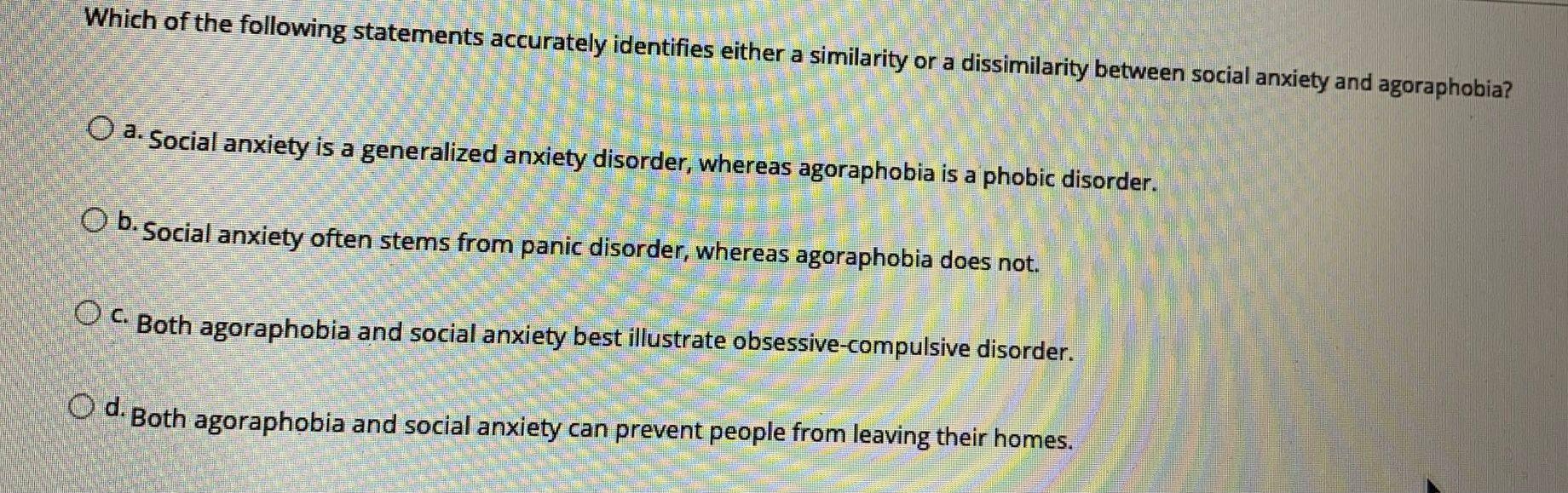 Which statement best describes research comparing psychological based treatments to drug treatments for generalized anxiety disorder. The paper compares and contrasts between two therapy options to find the best one for this client. People who suffer from phobias are most likely to.